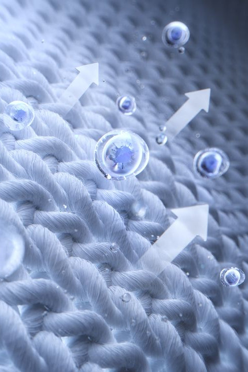 ほとんどの生地は単純な多孔質性によって通気性を持っています。当社のエアメッシュグリッドは、構造によって通気性を実現しています。独自の3次元正方織りを採用することで、従来の穿孔を必要とせずに構造的な完全性を維持した生地を開発しました。その結果、オープンメッシュの通気性を再現しながら、プレミアムニットの柔らかな肌触りを兼ね備えた生地が誕生しました。この生地は一連の制御されたプロセスで熱と湿気を管理し、汗がにじむ瞬間に吸い上げ、グリッド全体に拡散させて速やかに蒸発させます。テンポランの激しい中でも、汗でベタつく重さに悩まされることなく、快適に走り続けることができます。